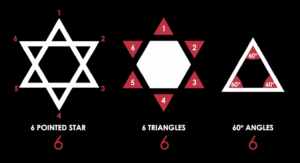 If we do a little digging, we can find that Remphan is another name for the god Kiyyun, pronounced Chiun, mentioned in Amos 5:26. And then looking further, we also see that Chiun is actually the god Saturn. So we learn now that the star of David is actually the star of Saturn. If we study the star of Saturn, we see that it has six points and there are six triangles that make up each of these six points and all three angles in an